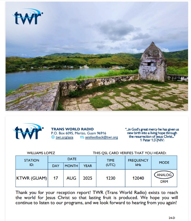 Mis QSL TWR Trans World Radio 2 El Informe de recepción fue enviado a: Esta dirección de correo electrónico está siendo protegida contra los robots de spam. Necesita tener JavaScript habilitado para poder verlo.