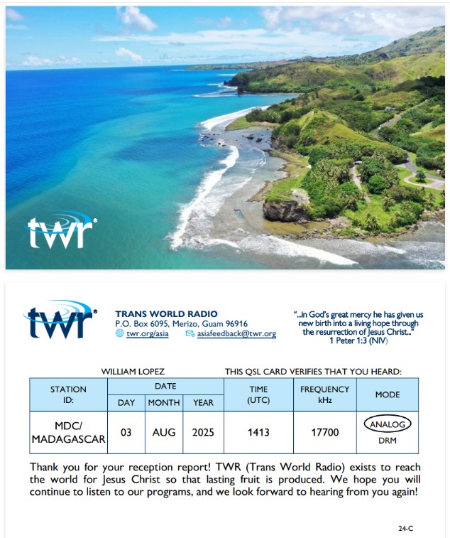 Mis QSL TWR Trans World Radio 3 El Informe de recepción fue enviado a: Esta dirección de correo electrónico está siendo protegida contra los robots de spam. Necesita tener JavaScript habilitado para poder verlo.